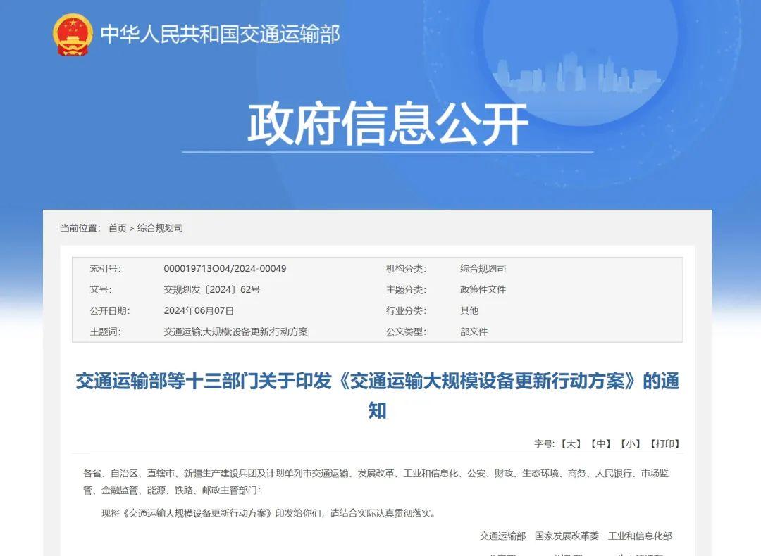 日前,交通運輸部、國家發(fā)展改革委、工業(yè)和信息化部等十三部門聯(lián)合印發(fā)《交通運輸大規(guī)模設備更新行動方案》(以下簡稱《方案》),將實施城市公交車電動化替代、老舊營運柴油貨車淘汰更新、老舊營運船舶報廢更新、老舊機車淘汰更新、郵政快遞老舊設備替代、物流設施設備更新改造、標準提升七大行動,大力促進先進設備和北斗終端應用,促進交通能源動力系統(tǒng)清潔化、低碳化、高效化發(fā)展,有序推進行業(yè)綠色低碳轉(zhuǎn)型。